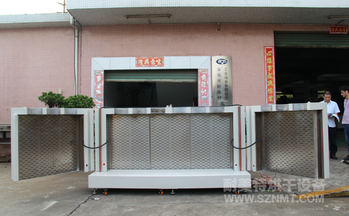 外形材質(zhì)采用2mm厚冷板折彎而成,表面高溫靜電噴塑(非普通油漆)耐腐蝕,防生銹,外形尺寸:寬2.6米,深0.85米,高1.3米,雙開門,配加強型鍍鉻方鋼門鎖,拉手,鍍鉻加強型合頁,烤箱頂箱開有6個∮250孔.